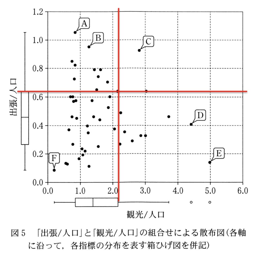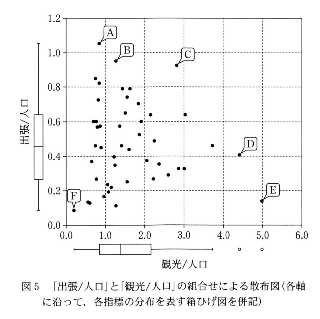 図5を見ると、例えば、観光等の旅行者が人口の4倍以上訪れる都道府県を表す点の数は[ケ]個である。このように、指標の値を見ることで、都道府県の人口に対して目的別の旅行者数がどの程度であったかを知ることができる。
