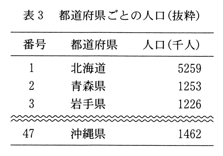 Uさんは、人口が多い都道府県には旅行の目的地になる場所(企業や観光名所など)が多く、旅行先になりやすいのではないかと考え、「出張等と観光等の旅行者数を、旅行先の各都道府県の人口で割った値」を指標とし、それぞれを出張/人口,観光/人口と呼ぶことにした。これらの指標は、旅行先の人口を基準として相対的に各目的の旅行者が多いか少ないかの程度を示すことになる。そこでUさんは、総務省統計局が公開している2019年度の都道府県ごとの人口のデータ(表3)を入手し、「出張/人口」と「観光/人口」の組合せについて、縦軸と横軸の値が等しい直線を記入した散布図(図4)を作成した。なお、この散布図中に完全に重なっている点はない。