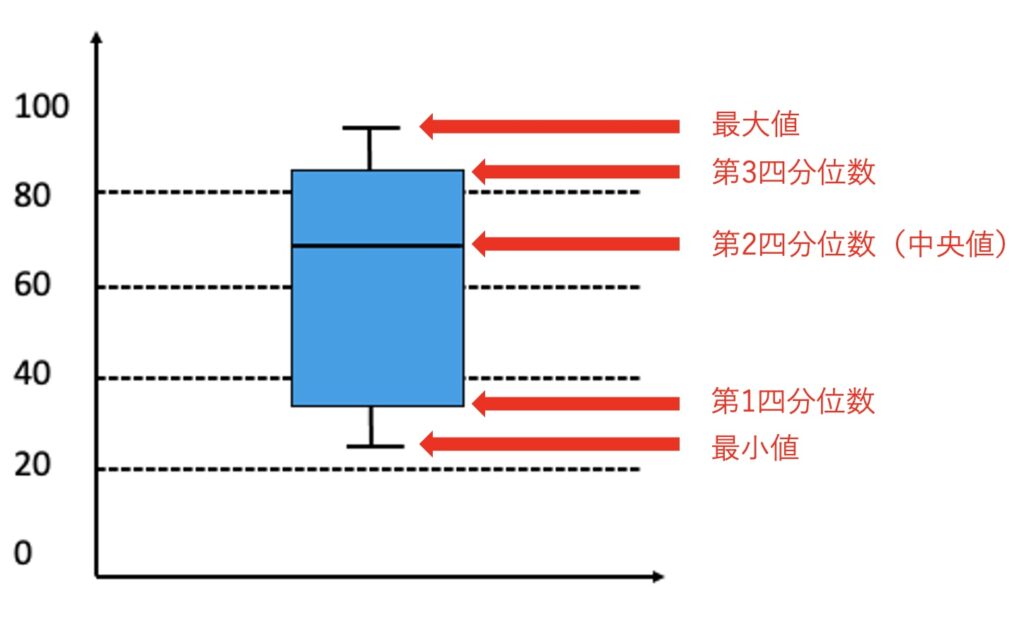 - 第1四分位数: データを小さい順に並べたとき、下から25%(4分の1)の位置にある値。箱の下側です。