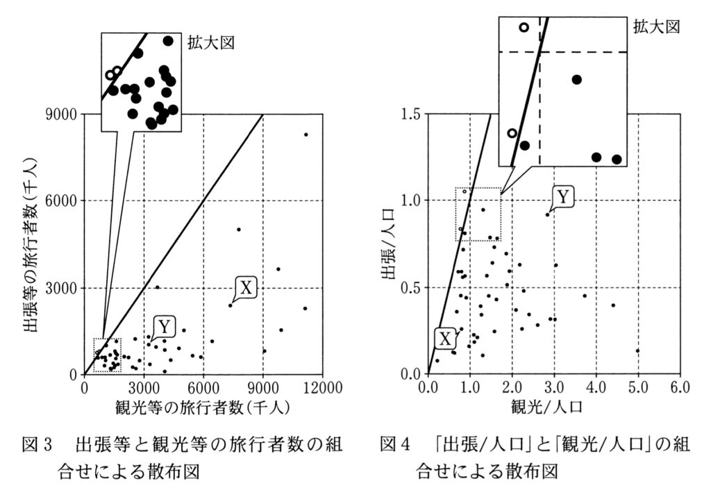 - 図4:縦軸が「出張/人口」、横軸が「観光/人口」です。もし「出張/人口 > 観光/人口」なら、点は必ず直線の上側に来ます。