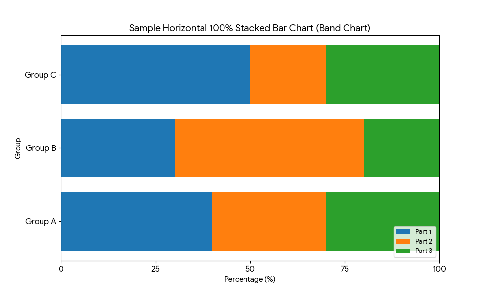 目的: 全体に対する「内訳の割合」を見るという点では円グラフと同じですが、帯グラフは特に、複数のグループ(例:部署Aと部署B、年代別など)の間でその内訳の割合がどう異なっているかを比較する能力に非常に優れています。円グラフを並べるよりも、変化や違いが一目瞭然になります。