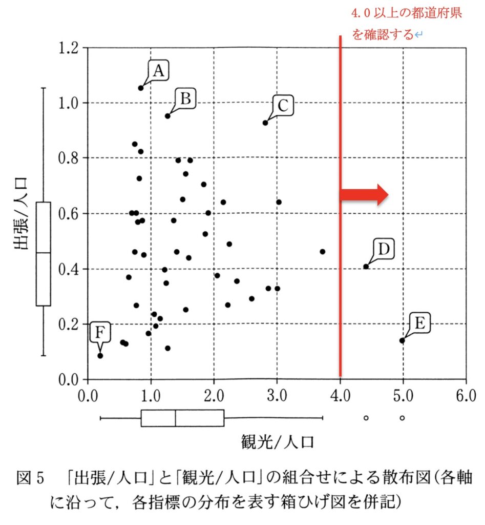 先に述べた通り、散布図は2つの異なるデータの間に、どのような関係性があるかを視覚的に探りたいときに使用するグラフです。図5を確認すると、縦軸も横軸も単なる旅行者数ではなく、それぞれ「出張/人口」、「観光/人口」という指標になっています。ここで、横軸の指標は観光客の数がその都道府県の人口の何倍にあたるかを示しています。したがって、問われている人口の4倍以上という条件は、横軸の「観光/人口」が4.0以上の点を探せば良いということになります。