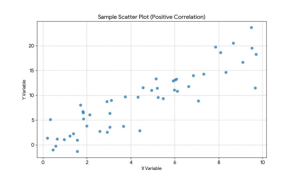 目的: 2つの異なるデータ(例:勉強時間と点数、気温とアイスの売上)の間に、どのような関係性があるかを視覚的に探りたいときに使用するグラフです。「Xが増えるとYは増えるのか、減るのか」といった、データ同士の連動性を知りたい時に使います。