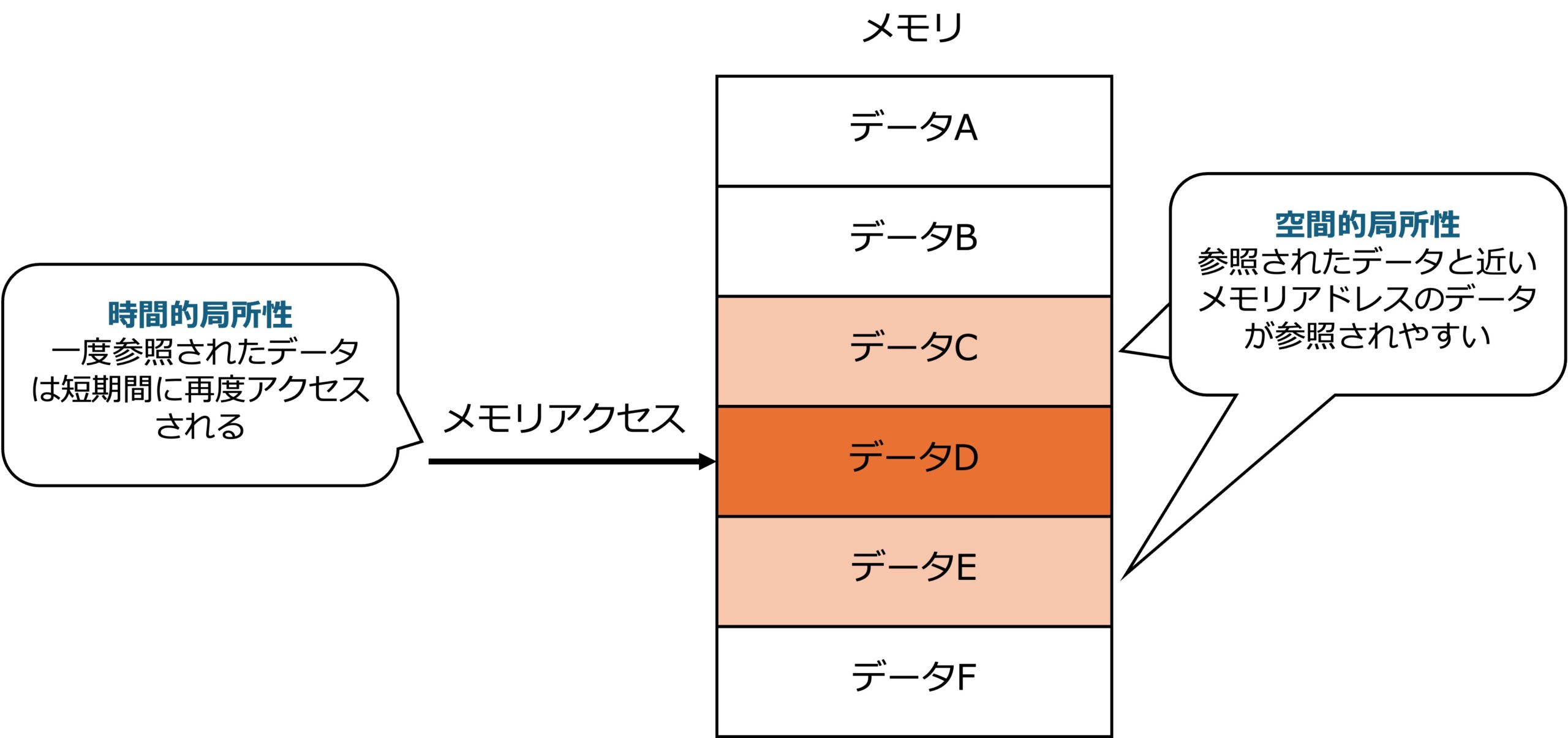 ・空間的局所性: 参照されたデータと近いメモリアドレス(メモリ内のそれぞれの場所に割り振られている番号)のデータが参照される性質