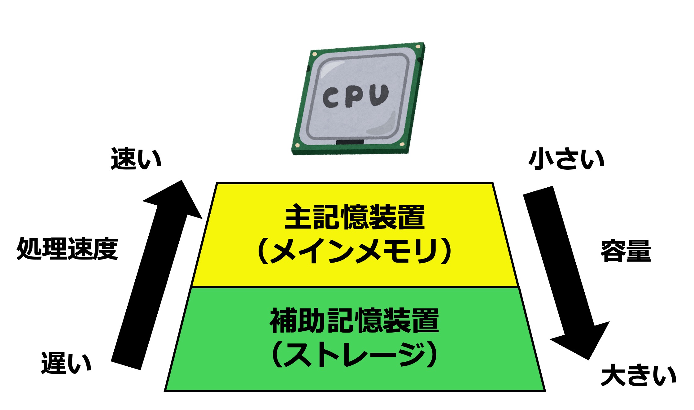 コンピュータには、役割の異なる2つの記憶装置が備わっています。これらは「速さ・容量・価格」において、それぞれ異なる特徴があり、まずはこれを確認しましょう。