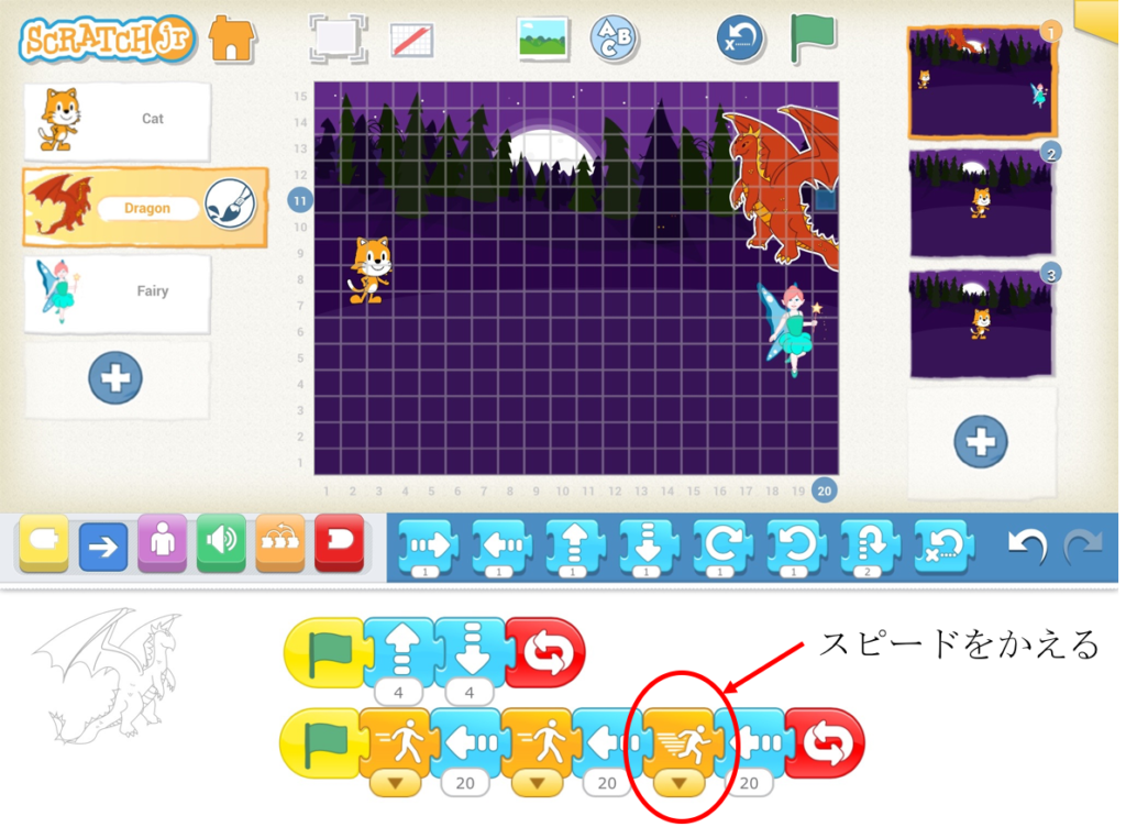 さて、キャラクタに動きをつけていきます。まずドラゴンです。ドラゴンは、ネコに襲いかかって欲しいので、右から左に移動します。移動するときにただまっすぐ飛んで行くのではなく、ゆらゆらとしながら飛行することにします。これはすでにコウモリのときにつかった方法ですが、上下する部分と左に動く部分を別でつくるとうまくいきます。上下の部分は4マス程度上下させるようにしました。また、左にうごかす部分は、単純に同じ速度だと飽きるので、速いスピードを混ぜることにしました。スピードを変えるブロックは、図にも示していますが、オレンジ色のブロックで人が走っている絵のブロックです。下の矢印を押すと速度が3段階選べます。ほかは、繰り返しうごかすために最後に赤い繰り返しブロックを置いています。
