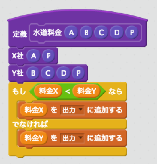 各社の計算の部分は、それぞれ「新しいブロック」を使って作ると見通しが良いと思います。新しいブロックを作るときに、A, B, C, D, P のそれぞれの値を数値の引数として利用できるようにすると、一つのブロックで該当するデータの計算ができるようになります。